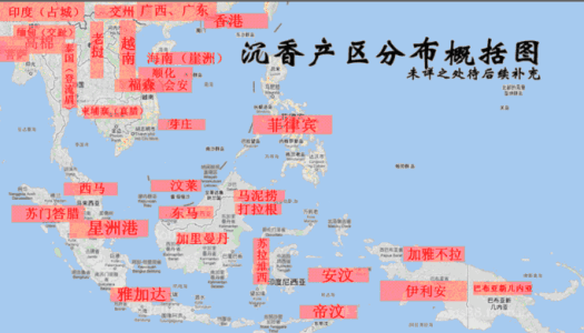 分为国香(海南香)、越南各省份沉香,柬埔寨菩萨省沉香,缅甸、泰国、越南富森红土等。国香目前存量较少,多为壳子料,也是最贵的沉香。惠安系的料子多空洞,难有好原料可以车制珠子,因此珠子类极少,雕件其次,多以熏材出现。芽庄产的奇楠品质最好,在所有奇楠类里一直居于首位。